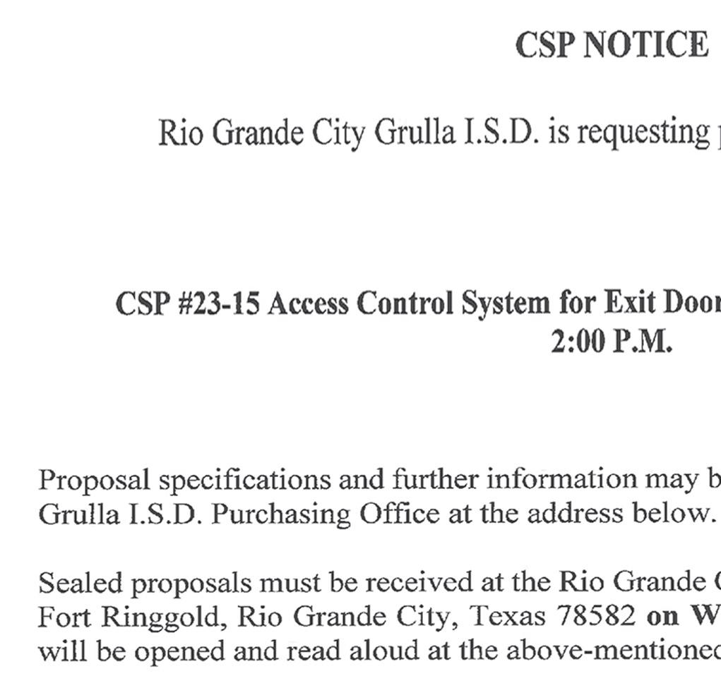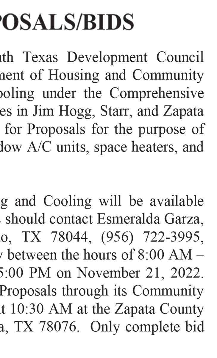 The County of Starr, is soliciting sealed bids to be received by Starr County Pct.#4 Commissioner Ruben D. Saenz at 100 N. FM 3167, Rio Grande City, TX 78582. Starr County’s normal business days are Monday thru Friday between the hours of 8:00 a.m. and 5:00 p.m.