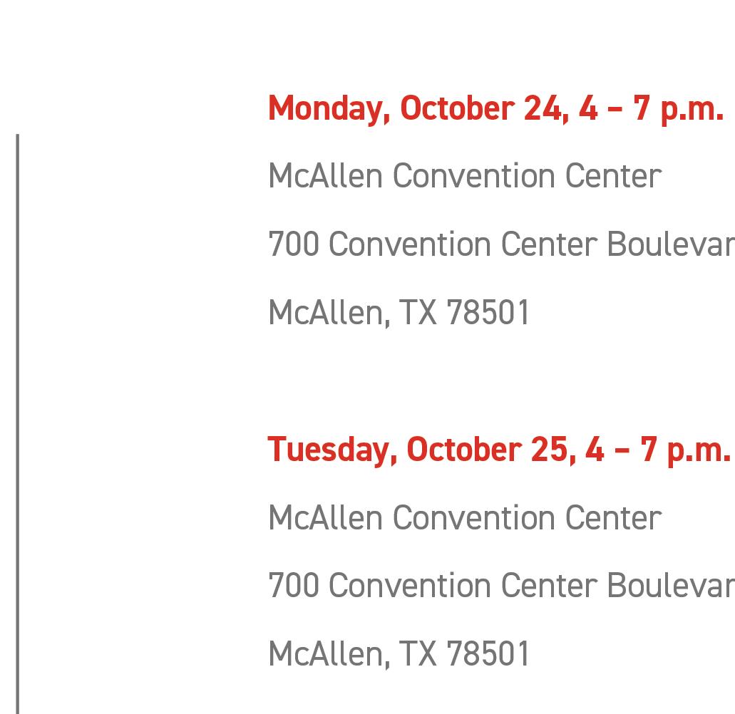 Monday, October 24, 4 – 7 p.m. McAllen Convention Center, 700 Convention Center Boulevard, McAllen, TX 78501 Tuesday, October 25, 4 – 7 p.m. McAllen Convention Center 700 Convention Center Boulevard, McAllen, TX 78501