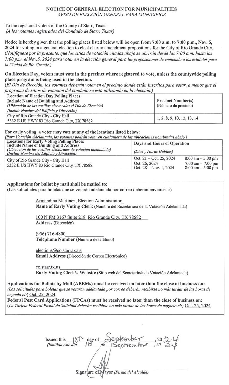 NOTICE is hereby given that it is the intention of the City Commission of the City of Rio Grande City, Texas (the “City”) to issue interest-bearing Certificates of Obligation of the City to be designated and known as the “CITY OF RIO GRANDE CITY, TEXAS COMBINATION TAX AND REVENUE CERTIFICATES OF OBLIGATION, SERIES 2024” (the “Certificates”) for the purpose of providing for the payment of contractual obligations to be incurred for the design, planning, acquisition, equipping, construction, and renovation of public property, and designated infrastructure and for other public purposes specifically being (i) water system improvements; and (ii) the payment of contractual obligations for professional services in connection with such projects (including, but not limited to, financial advisory, legal, architectural, and engineering). The City Commission tentatively proposes to authorize the issuance of the Certificates at its regular meeting place at Commission Chambers, City Hall, 5332 East US Highway 83, Suite A, Rio Grande City, Texas, at a Regular Meeting of the City Commission to be commenced at 12:00 p.m., on the 12th day of November, 2024, in an amount not to exceed $5,655,000. The City Commission proposes to provide for payment of the Certificates of Obligation from a pledge of an annual ad valorem tax, as well as a junior lien pledge of the net revenues of the City’s Waterworks and Sewer System. The Certificates are to be issued, and this notice is given, pursuant to Section 271.041, et seq., Texas Local Government Code.