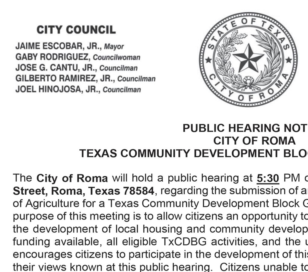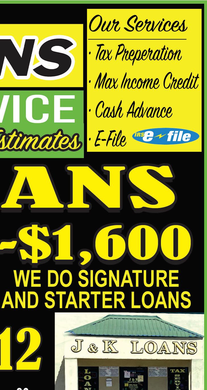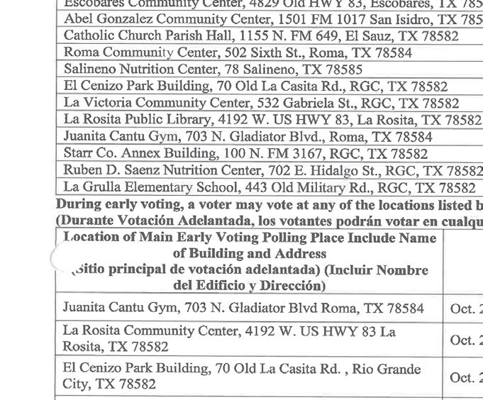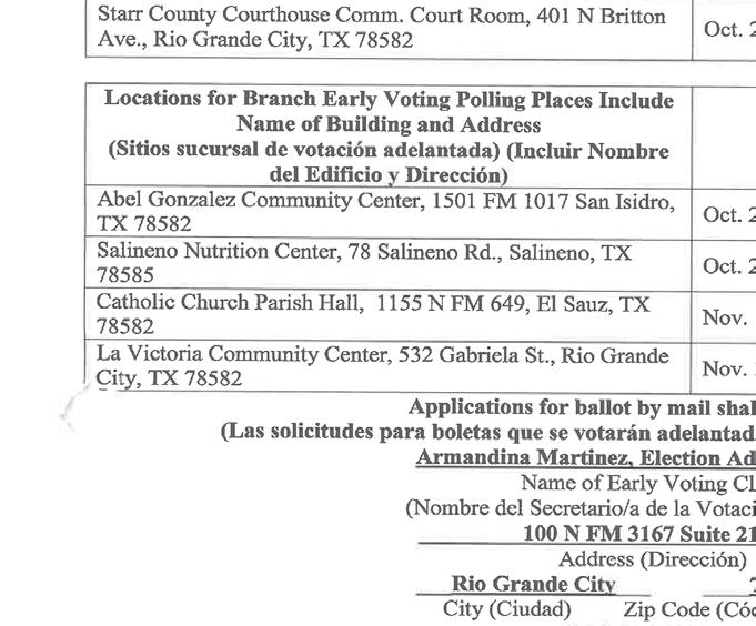 487-2440 300 East Main St. R.G.C. STARR VISION CENTER Dr. Angie Ramirez erapeutic Optometrist 488-0808 280 W. 2nd St. R.G.C. CASTAÑEDA Auto Insurance & Bail Bonds 487-7000 487-2596 4350 E. US HWY 83 R.G.C. • Individual • Partnership • Corporations • LLC’s • Bookkeeping • Payroll • Financial Statements • Form 2290 • IRS Audit Representation Mario A. Méndez, EA Licensed to practice before the IRS (Internal Revenue Service) 317-1124(956) 201 S. San Antonio. St. Rio Grande City, TX (NEW LOCATION) Vol. 37, No. 40 WEEKLY WEDNESDAY • OCTOBER 5, 2022 Office (956) 487-6544 - Fax (956) 487-6165 - E-Mail: sctc78582@aol.com - www.starrcountytowncrier.com OPEN MON-SUN 7AM-7PM 956-487-2140 5470 E. HWY 83 R.G.C. TX 956-519-3237 • 6601 W. HWY 83 - MISSION, TX BIG DOOR SALE LARGE SELECTION WE HAVE A NEW LINE OF DOORS AVAILABLE The Law Office Of 956-317-1167 206 N. Britton Ave. Ste.B, R.G.C. jmchemagarza@gmail.com J.M. “Chema” Garza Criminal Cases (Federal/State) Car Accidents/ 18 Wheeler Divorces • Real Estate/Deeds Dr. Raymond Cruz Best FAMILY & COSMETIC DENTISTRY Dental Insurance, Medicaid and Chip Accepted 419 East 2nd St. Rio Grande City, Tx. 487-2999 668 E. Grant St. Ste A&B Roma TX 78584-5312 Phone (956) 849-4497 Installment Loans