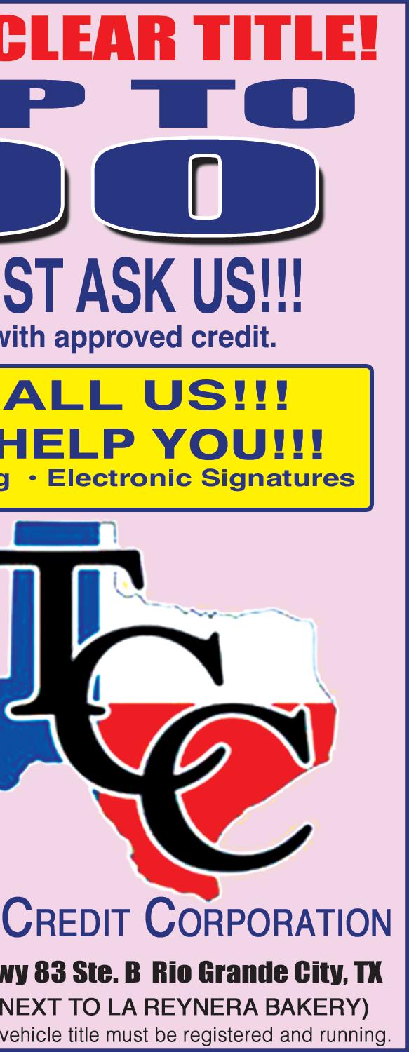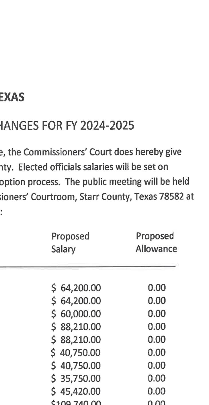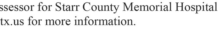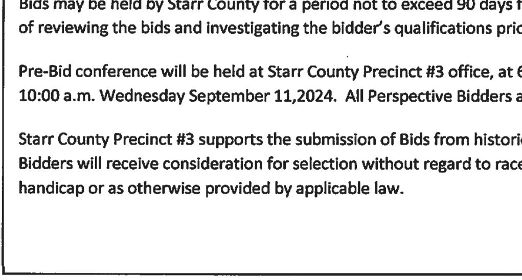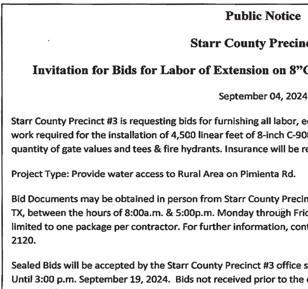 Notice is hereby given, pursuant to Chapter 263.153 of the Texas Local Government Code & Chapter 59 of the Texas Code of Criminal Procedure and Transportation Code 683, Subsection B, 683.012, of the Texas Department of Transportation that the County of Starr Sheriff ’s Office, Rio Grande City, Texas will hold a public auction on Saturday, September 28th , 2024, at 10:00 a.m. for General Surplus, Equipment and Vehicles which have been forfeited to the State of Texas under the provisions of Chapter 59 Texas Code of Criminal Procedure. Location: 2101 I-69C, Edinburg, TX 78542. Registration to bid will be from 8:00 a.m. to 10:00 a.m. and will require a picture identification. Examples of items to be auctioned are cars, trucks, heavy equipment, personal computers, electronics, office furniture, surplus, etc. All items will be sold “As Is - Where Is” to the highest bidder. Onsite Buyer’s Premium 14%, Internet Buyer’s Premium 16%. All sales are final and must be paid on the same day with cash, major credit cards (Visa, Master Card, Discover, American Express), Debit & Credit with a 3.99% processing fee. Checks accepted “day of auction” only with certain conditions. For additional information, please contact the County of Starr Sheriff ’s Office, at (956) 487-5571. AUC#17532 - Jose A. Camarillo