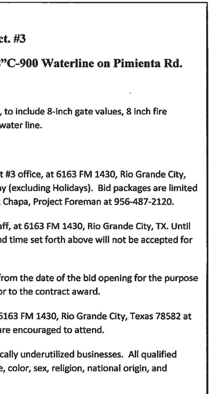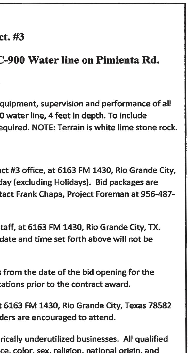Specifications and Bid Documents may be obtained at the City Secretary’s Office at City Hall located at 5332 E. US Highway 83, Rio Grande City, Texas 78582 or at the city website link: https://www.cityofrgc.com/business/bid_opportunities.php. For any questions you can contact Projects Director – Elisa Y. Beas at (956) 488 – 8728.