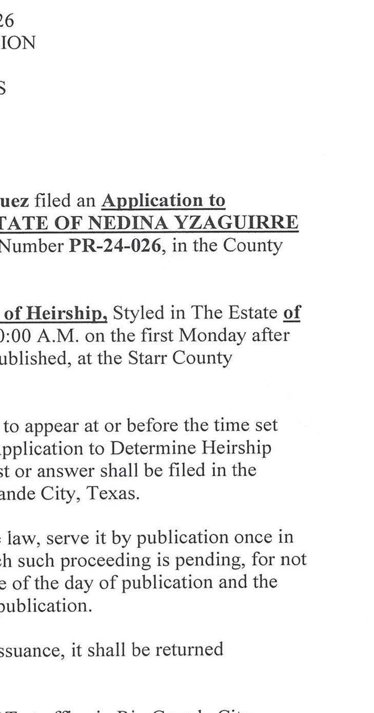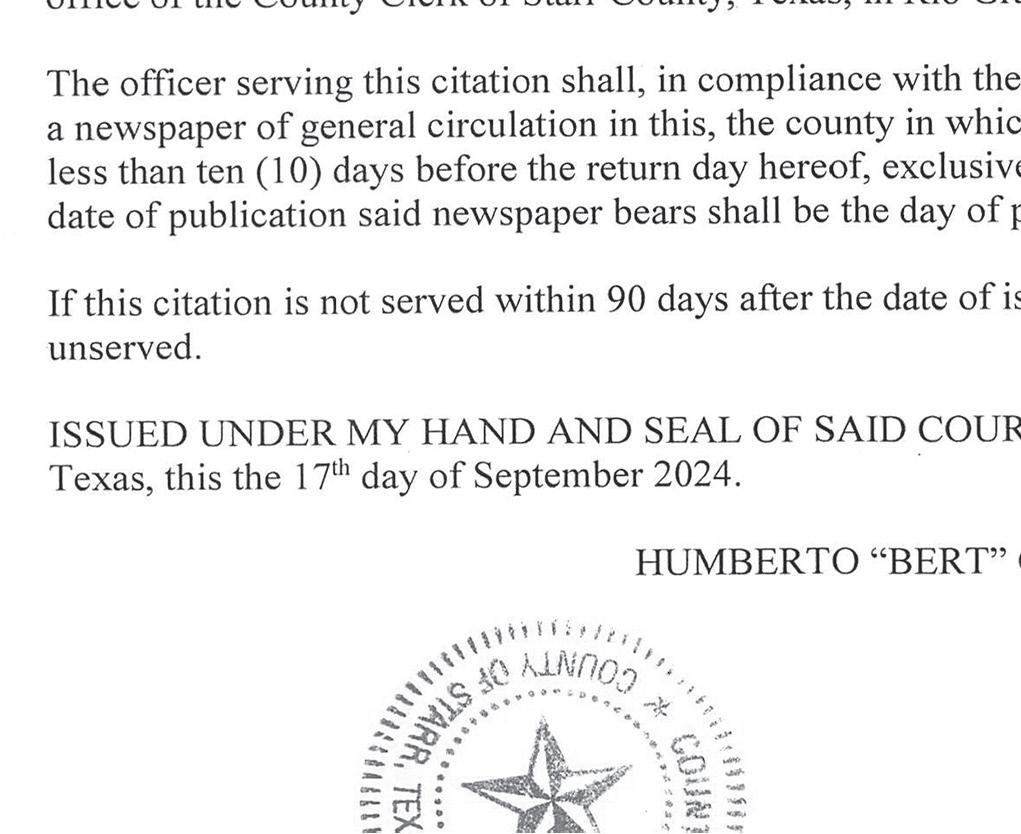 NOTICE is hereby given that it is the intention of the City Commission of the City of Rio Grande City, Texas (the “City”) to issue interest-bearing Certificates of Obligation of the City to be designated and known as the “CITY OF RIO GRANDE CITY, TEXAS COMBINATION TAX AND REVENUE CERTIFICATES OF OBLIGATION, SERIES 2024” (the “Certificates”) for the purpose of providing for the payment of contractual obligations to be incurred for the design, planning, acquisition, equipping, construction, and renovation of public property, and designated infrastructure and for other public purposes specifically being (i) water system improvements; and (ii) the payment of contractual obligations for professional services in connection with such projects (including, but not limited to, financial advisory, legal, architectural, and engineering). The City Commission tentatively proposes to authorize the issuance of the Certificates at its regular meeting place at Commission Chambers, City Hall, 5332 East US Highway 83, Suite A, Rio Grande City, Texas, at a Regular Meeting of the City Commission to be commenced at 12:00 p.m., on the 12th day of November, 2024, in an amount not to exceed $5,655,000. The City Commission proposes to provide for payment of the Certificates of Obligation from a pledge of an annual ad valorem tax, as well as a junior lien pledge of the net revenues of the City’s Waterworks and Sewer System. The Certificates are to be issued, and this notice is given, pursuant to Section 271.041, et seq., Texas Local Government Code.