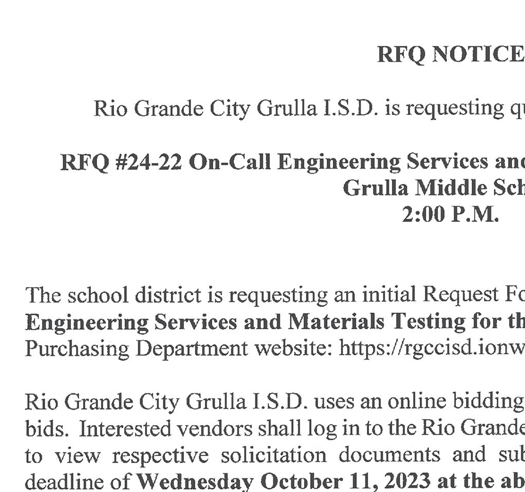487-2440 300 East Main St. R.G.C. STARR VISION CENTER Dr. Angie Ramirez erapeutic Optometrist 488-0808 280 W. 2nd St. R.G.C. CASTAÑEDA Auto Insurance & Bail Bonds 487-7000 487-2596 4350 E. US HWY 83 R.G.C. • Individual • Partnership • Corporations • LLC’s • Bookkeeping • Payroll • Financial Statements • Form 2290 • IRS Audit Representation Mario A. Méndez, EA Licensed to practice before the IRS (Internal Revenue Service) 317-1124 (956) 201 S. San Antonio. St. Rio Grande City, TX (NEW LOCATION) Vol. 38, No. 39 WEEKLY WEDNESDAY • SEPTEMBER 27, 2023 Office (956) 487-6544 - Fax (956) 487-6165 - E-Mail: sctc78582@aol.com - www.starrcountytowncrier.com The Law Office Of 956-317-1167 206 N. Britton Ave. Ste.B, R.G.C. jmchemagarza@gmail.com J.M. “Chema” Garza Criminal Cases (Federal/State) Car Accidents/ 18 Wheeler Divorces • Real Estate/Deeds Dr. Raymond Cruz Best FAMILY & COSMETIC DENTISTRY Dental Insurance, Medicaid and Chip Accepted 419 East 2nd St. Rio Grande City, Tx. 487-2999 311 E Main St Rio Grande City TX 78582-4448 Phone (956) 487-3925 Installment Loans J.M. “Chuy” Alvarez CHUY Alvarez 501 N. Britton Ave • Rio Grande City, Texas 956-487-4871 Cell: 956-208-0282 NOT CERTIFIED BY THE TEXAS BOARD OF LEGAL SPECIALIZATION ATTORNEY AT LAW Celebrating the