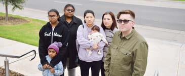 Reece Gains (right) who has started a petition for better bus services in Harpley, Cornerstone, and Mambourin estates, with fellow residents (from left) Niranjana Raja and children Mananya, 13, and Maalini, 5, Megan Lam and baby Riley and Thao Le. (Damjan Janevski) 400659_02