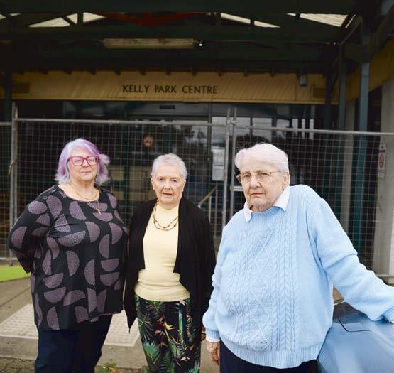 Wyndham Combined Probus members Sandra Carnovale, Lyn Scott and Judy Maroh outside the club’s former home, Werribee’s Kelly Park Centre, which Wyndham council has decided to demolish two years after it was destroyed by fire. (Damjan Janevski) 400871_02
