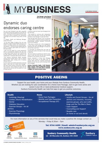 Dynamic duo endorses caring centre Don and Jean Chesworth have been supported by Sunbury Community Health for more than 20 years. Turning 90 and 89 respectively this year, the couple’s story is a dynamic one, marking the challenges and successes facing many as they age. Jo Howard, Health and Wellbeing Manager, shares that story: “In the early stages of ageing, Don and Jean attended a range of allied health services at our centre, including podiatry and physiotherapy,� she explains. “They also joined a weekly exercise group to maintain good health and mobility in the years ahead. “Later, the pair asked for a home assessment from an occupational therapist who was able to give advice about kitchen and mobility aids as their physical functions and ability to be independent in everyday tasks became affected. “The Sunbury Community Health volunteer driving service helped them to get to medical appointments when driving out of Sunbury became difficult.� As their health and mobility declined in ensuing years, it was time for a Home Care Package – and they chose Sunbury Community Health as their provider. They’d always felt happy over the years with the services and the people so it was an easy decision.