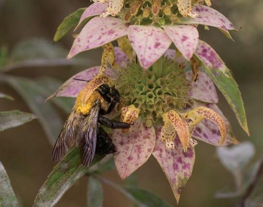 Native plants and bees have been co-evolving in our landscape for millions of years, developing relationships and dependencies that non-native species cannot equally fulfill. Some native plants are more helpful in supplying pollen, nectar and nesting materials for bees than others, so providing species in your yard that are known resources for bees is ideal. For example, native species in the Monarda genus (beebalm) will not only attract bees for their pollen and nectar but also have pithy stems that some use to create nesting chambers over winter and in the growing season.