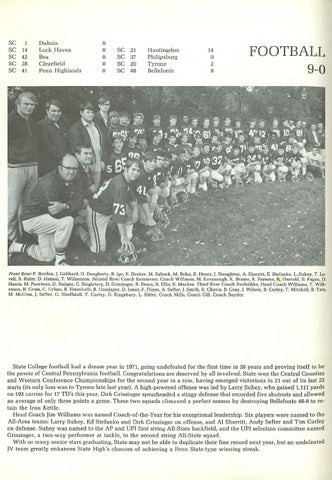 State College football had a dream year in 1971, going undefeated for the first time in 26 years and proving itself to be the power of Central Pennsylvania football. Congratulations are deserved by all involved. State won the Central Counties and Western Conference Championships for the second year in a row, having emerged victorious in 21 out of its last 22 starts (its only loss was to Tyrone late last year). A high-powered offense was led by Larry Suhey, who gained 1,111 yards on 193 carries for 17 TD's this year. Dirk Grissinger spearheaded a stingy defense that recorded five shutouts and allowed an average of only three points a game. These two squads climaxed a perfect season by destroying Bellefonte 48-8 to retain the Iron Kettle. Head Coach Jim Williams was named Coach-of-the-Year for his exceptional leadership. Six players were named to the All-Area teams: Larry Suhey, Ed Stefanko and Dirk Grissinger on offense, and Al Sherritt, Andy Sefter and Tim Curley on defense. Suhey was named to the AP and UPI first string All-State backfield, and the UPI selection committee named Grissinger, a two-way performer at tackle, to the second string All-State squad. With so many senior stars graduating, State may not be able to duplicate their fine record next year, but an undefeated JV team greatly enhances State High's chances of achieving a Penn State-type winning streak.