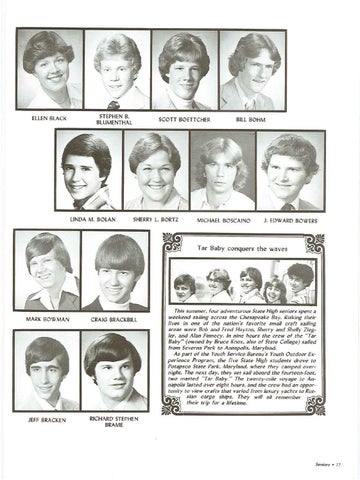 This summer, four adventurous State High seniors spent a weekend sailing across the Chesapeake Bay. Risking their lives in one of the nation's favorite small craft sailing areas were Bob and Fred Hayton, Sherry and Shelly Zlegler, and Alan Finnecy. In nine hours the crew of the ''Tar Baby" (owned by Bruce Knox, also of State College) sailed from Severna Park to Annapolis, Maryland. As part of the Youth Service Bureau's Youth Outdoor Experience Program, the five State High students drove to Potapsco State Park, Maryland, where they camped overnight. The next day, they set sail aboard the fourteen-foot, two masted ''Tar Baby." The twenty-mile voyage to Annapolis lasted over eight hours, and the crew had an opportunity to view crafts that varied from luxury yachts to Russian cargo ships. They will all remember their trip for a lifetime.