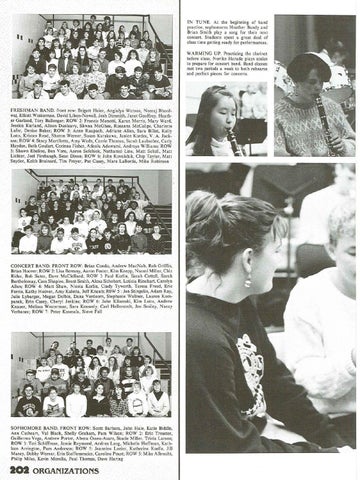 FRESHMAN BAND. front row: Brigett Heier, Angielyn Watson, Neeraj Bhardwaj, Elliott Westerman, David Liben-Nowell, Josh Dirsmith, Janet Geoffroy, Heather Garland, Tory Ballenger; ROW 2: Francis Menotti, Karen Morris, Mary Ward, Jessica Kurland, Alison Dunleavy, Shwna McGhee, Rosanna McCalips, Charlotte Lafer, Denise Baker; ROW 3: Anne Raupach, Adriane Allen, Sara Billet, Kelly Lotts, Kristen R ead, Sharon Werner, Susan Karakawa, Janice Kordes, V. A. Jackson; ROW 4: Stacy Martilotta, Amy Wade, Carrie Thomas, Sarah Laubscher, Carly Hayden, Beth Goulart, Corinna Fisher, Adeolu Adewumi, Andreya Williams; ROW 5: Shawn Ebeline, Ben Vore, Aaron Sefchick, Nathaniel Line, Matt Schell, Matt Lichter, Joel Firebaugh, Sean Dixon; ROW 6: John Kovalchik, Chip Taylor, Matt Snyder, Keith Brainard, Tim Freyer, Pat Casey, Mare LaBorde, Mike Robinson
