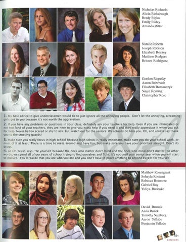 2. If you have any problems or questions in your class, definitely ask your teachers for help. Even if you are intimidated or not too fond of your teachers, they are here to give you extra help if you need it and they really appreciate it when you ask for help. Never be too scared or shy to ask. But, watch out for the seniors. We actually do hate you. Oh, and always say thank you to the crossing guards! 3. Make sure you really focus in high school because high school is really important. Make sure you do your school work, or most of it at least. There is a time to mess around and have fun, but make sure you have your priorities straight. Don't do drugs. 4 . As Dr. Seuss says, "Be yourself because the ones who matter don't mind and the ones who mind don't matter." In other words , we spend all of our years of school trying to find ourselves and fit in. It's not until your senior year when you will start to mature . You'll realize that you are who you are and you don't have to prove anything to anyone except for yourself.