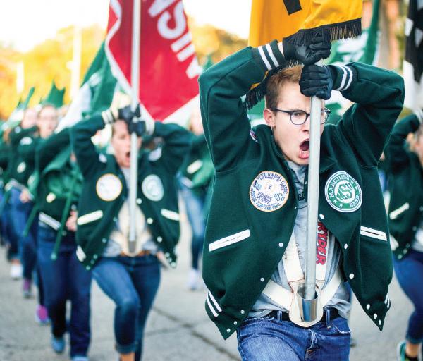 File Photo BELOW: Political science sophomore Aaron Meek yells a chant with other members of the Color Guard during the Homecoming Parade on Oct. 14, 2016 along Abbot Road. State News File Photo