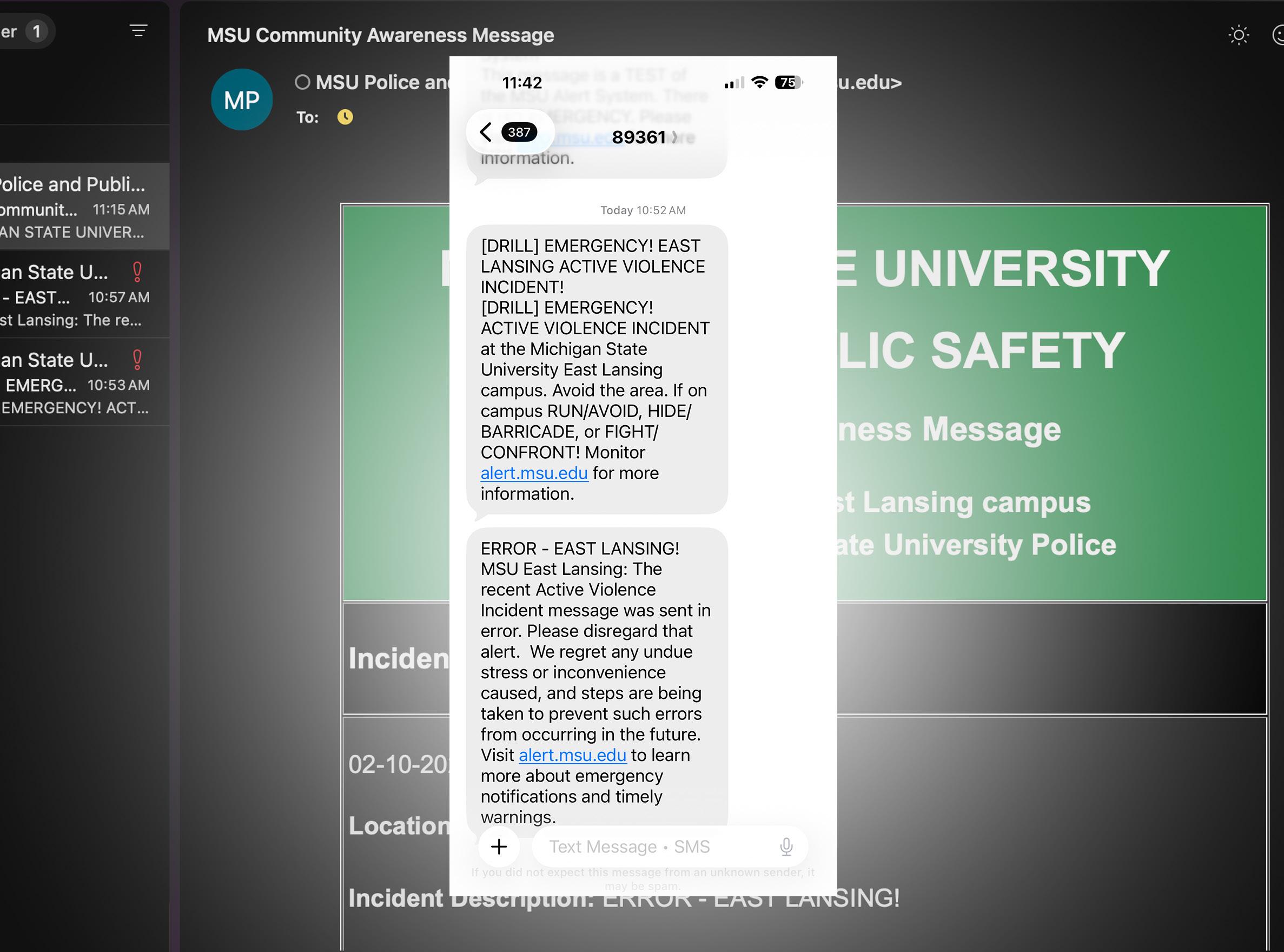 For some students and parents, the word “drill” was omitted from the initial alert they received, causing them to fear an actual active violence incident was occurring. That notification plainly read, “Emergency! Active violence incident at the MSU East Lansing Campus. Avoid the area”.