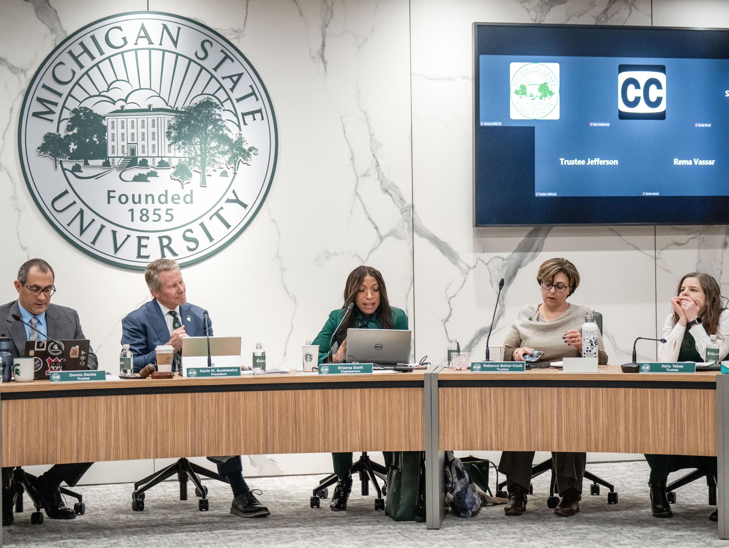 MSU President Kevin Guskiewicz acknowledged the contingent of trustees present over Zoom, adding that Tebay was “en route” to the board meeting and Vassar would be “joining a bit later this morning.”