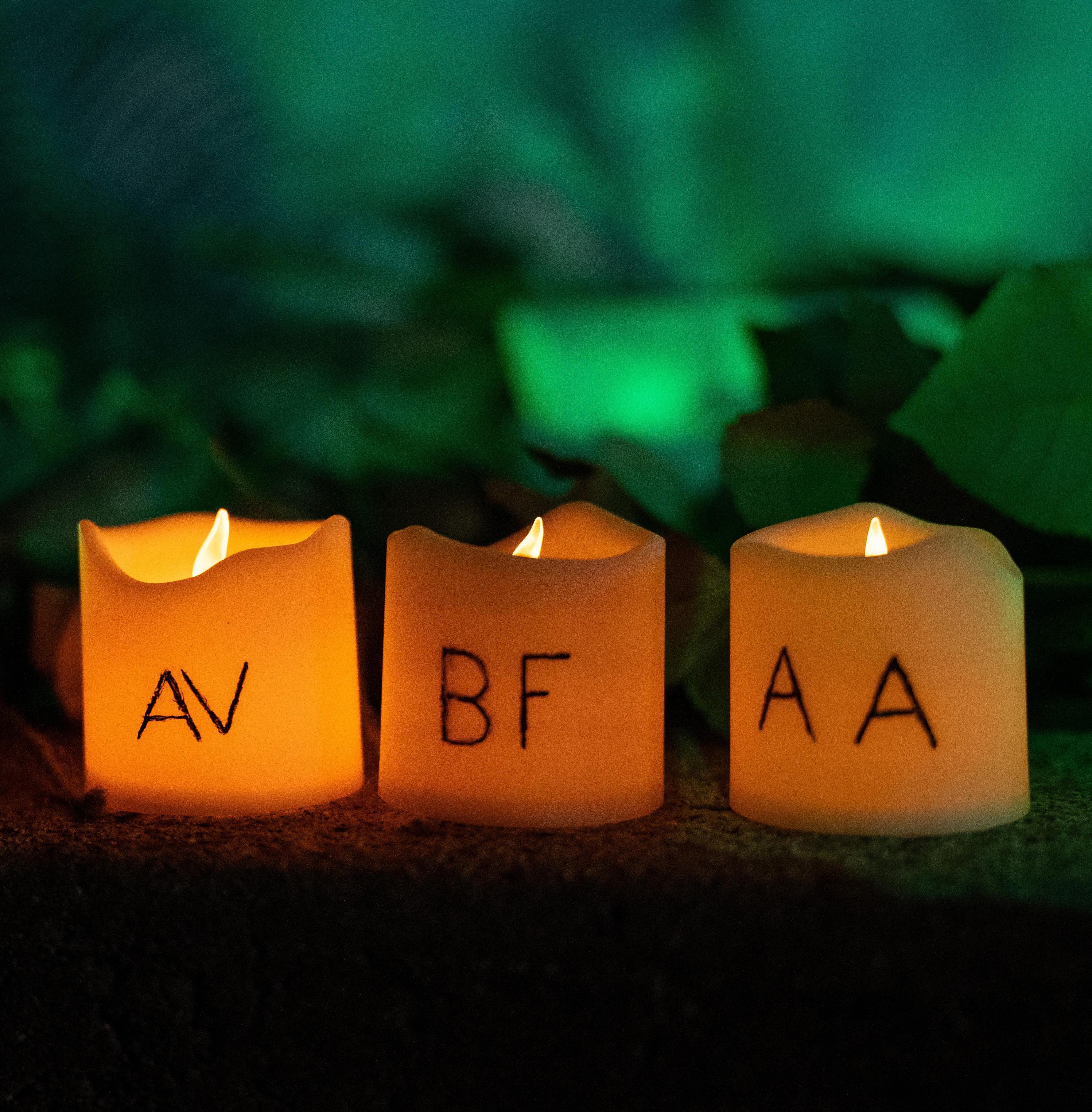 On Feb. 13, 2024, candles surrounding the Spartan Statue read the initials of the victims of the 2023 campus shooting – Alexandria Verner, Brian Fraser and Arielle Anderson. Photo by Alexis Schmidt.