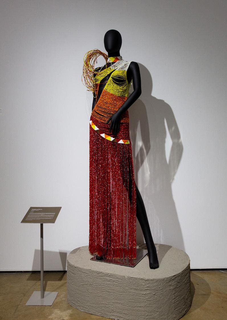 Wat ik altijd geweldig heb gevonden aan tentoonstellingen, is dat je kleding kunt herdefiniëren en opnieuw kunt kaderen in hoe we erover denken. Ik vond het een mooie kans om enkele van de intellectuele en filosofische draden die inherent aanwezig zijn in het werk naar voren te brengen. Of het nu gaat om het maakproces zelf of de oorsprong en conceptualisering van het werk. Maar het belangrijkste was om dit niet alleen te verbinden met de mensen, maar ook met het land dat deze ideeën mede vormt en beïnvloedt. Om deze connectie te benadrukken, hebben we de tentoonstellingsruimte gevuld met aarde, wat symbool staat voor verbondenheid en geworteld zijn. Op het continent heeft aarde een diepe betekenis; het herinnert ons aan waar we vandaan komen, vormt een link naar ons erfgoed, en symboliseert identiteit en plaats. In een tijd waarin verbondenheid steeds ongrijpbaarder en waardevoller voelt, was dit element een bewuste keuze om de thema’s van de tentoonstelling te verankeren en met elkaar te verbinden.