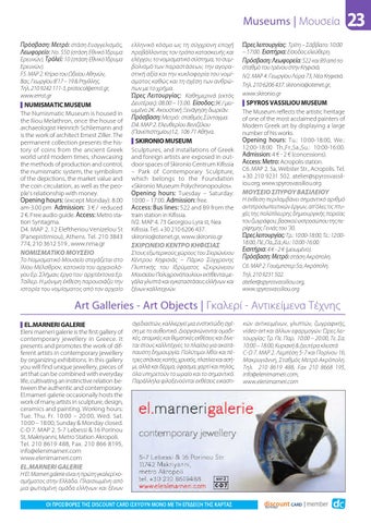 Museums | Μουσεία Πρόσβαση: Mετρό: στάση Ευαγγελισμός, Λεωφορείο: No. 550 (στάση Εθνικό Ίδρυμα Ερευνών), Τρόλεϊ: 10 (στάση Εθνικό Ίδρυμα Ερευνών). F5. MAP 2. Κτίριο του Ωδείου Αθηνών, Βας. Γεωργίου B’17 – 19 & Ρηγίλλης. Tηλ. 210 9242 111-3, protocol@emst.gr, www.emst.gr NUMISMATIC MUSEUM The Numismatic Museum is housed in the Iliou Melathron, once the house of archaeologist Heinrich Schliemann and is the work of architect Ernest Ziller. The permanent collection presents the history of coins from the ancient Greek world until modern times, showcasing the methods of production and control, the numismatic system, the symbolism of the depictions, the market value and the coin circulation, as well as the people’s relationship with money. Opening hours: (except Monday): 8.00 am-3.00 pm Admission: 3 € / reduced 2 €. Free audio guide. Access: Metro station Syntagma. D4. MAP 2. 12 Eleftheriou Venizelou St (Panepistimiou), Athens. Tel. 210 3843 774, 210 3612 519 , www.nma.gr ΝΟΜΙΣΜΑΤΙΚΟ ΜΟΥΣΕΙΟ Το Νομισματικό Μουσείο στεγάζεται στο Ιλίου Μέλαθρον, κατοικία του αρχαιολόγου Ερ. Σλήμαν, έργο του αρχιτέκτονα Ερ. Τσίλερ. Η μόνιμη έκθεση παρουσιάζει την ιστορία του νομίσματος από τον αρχαίο