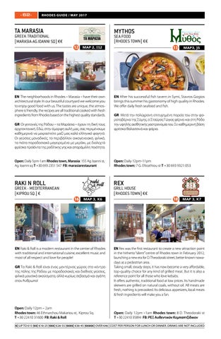 Open: Daily 5pm-1am Rhodes town, Marasia: 155 Ag. Ioanni st, Ag. Ioanni sq T +30 693 2351 547 FB: marasiarestaurant