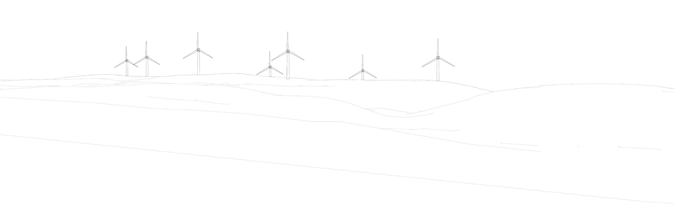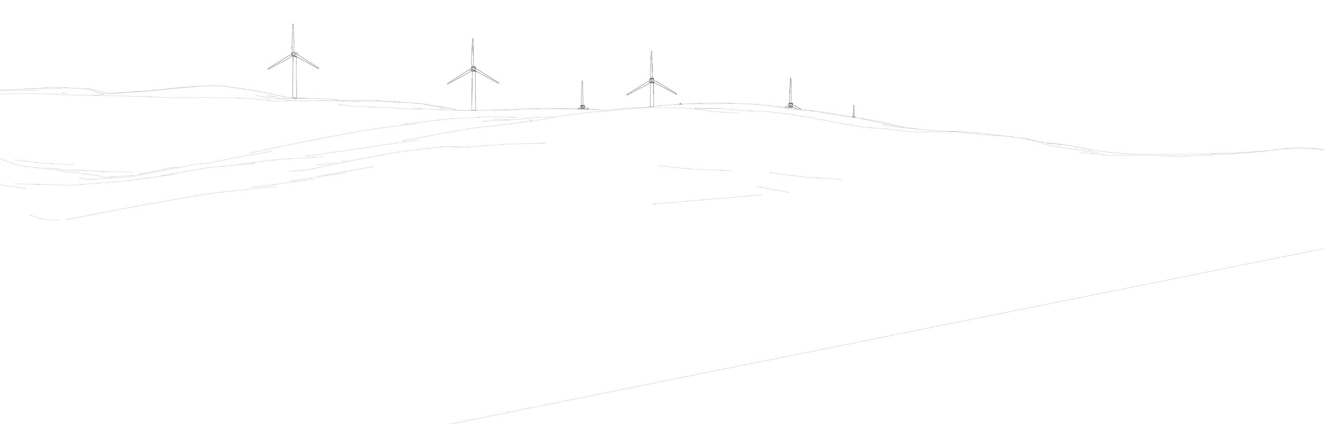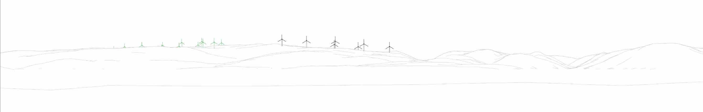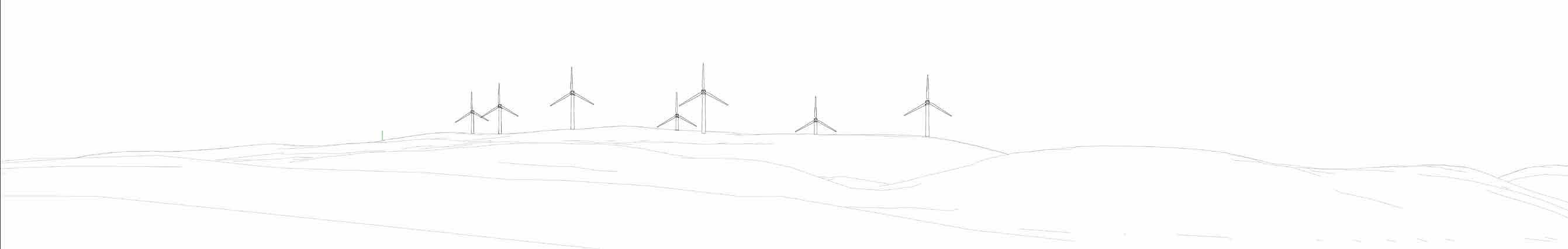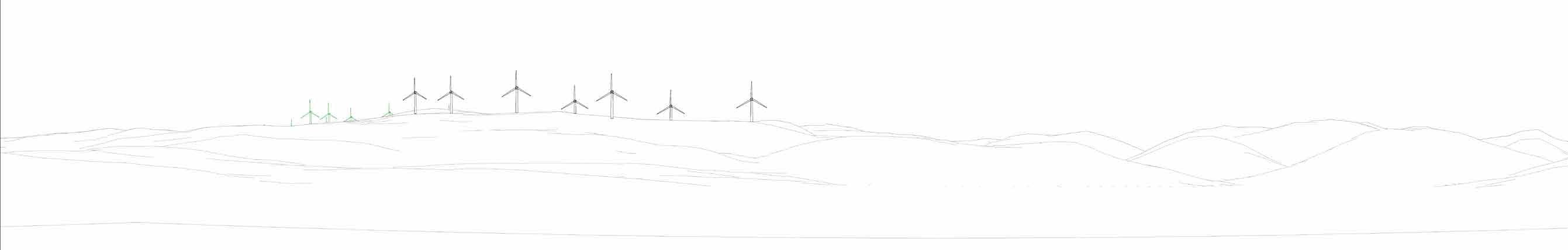 Wireframe showing current proposed layout. Based on current proposal of 7 turbines @ up to 200m to blade tip height.