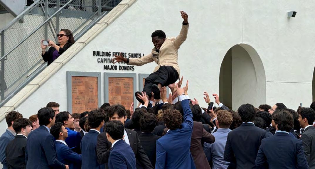 SENIORS ON THE MARCH. As per another hallowed Saints graduation tradition, the Class of 2024 participates in the Senior March, a parade halls, pathways and patios led by the Saints Pep Band playing the familiar “When the Saints Come Marching in.” At the end of the march participating Seniors gather for another beloved rite of brotherhood—The Big Toss, where fellow classmates are launched in the air. So far, everyone has landed safely.