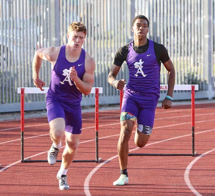 HURDLES: Saintsmen Charlie Berkley (’25) and Anthony Etheridge (’27) cleared the final high hurdles and are sprinting to the finish.