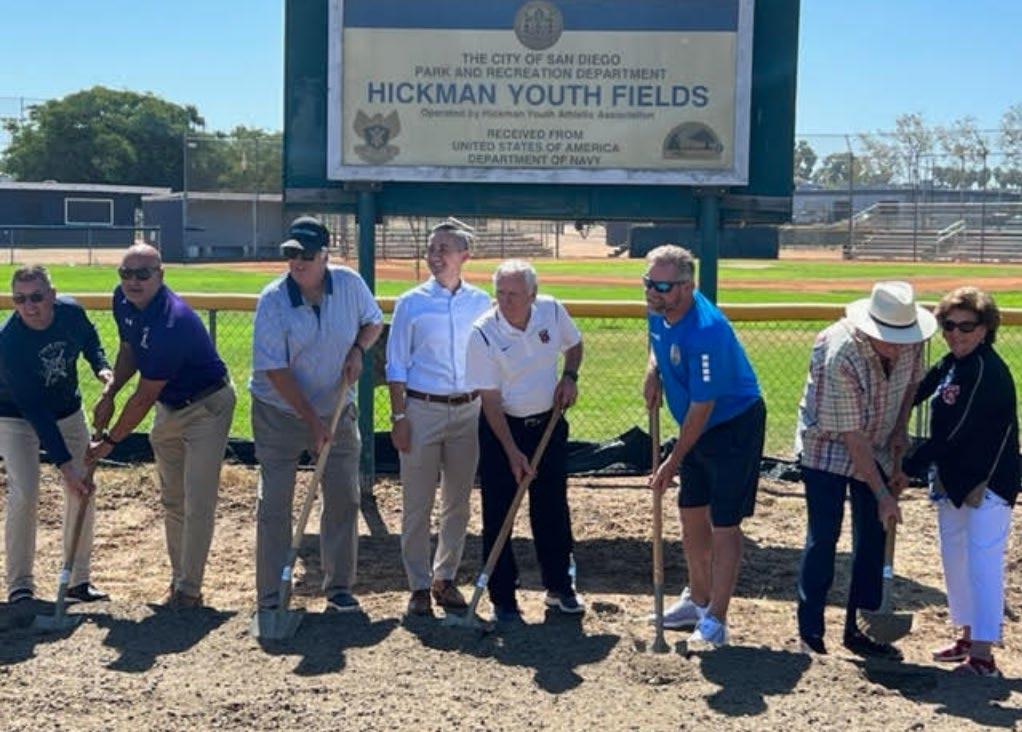 HOME PLATE. The Hickman Improvement Project is underway at Hickman Field, which is home to our Saints Baseball Program, where Saints play home games on Stephenson Diamond at Whittaker Field (above).GROUNDBREAKERS. Community leaders and Hickman Field associates met recently to break ground on the much-awaited revitalization program for the Hickman youth fields in North Clairemont. Left to right are North City Youth Baseball Board Member; Craig DaLuz, Saints Baseball Coach and Board Member; HYAA President and Power Surge Softball Board Member: San Diego City Councilman Chris Cate; Mesa Soccer/Albion Soccer Club Board Member; Nomads Soccer Club Board Member and Nomads Soccer Club and HYAA Secretary.