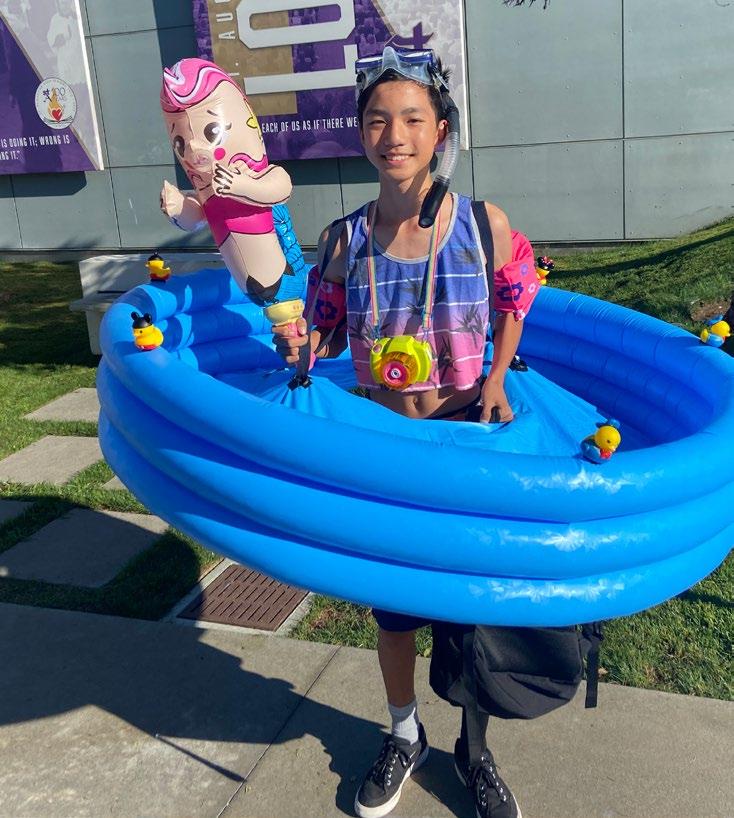 CREATIVE. Freshman Gabriel Nguyen with one of the more creative costumes was snorkeling in the kiddie pool all day.