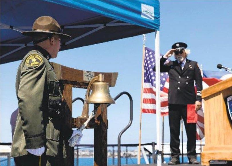 REMEMBERED. During last month’s 9/11 remembrance ceremony on the flight deck of San Diego-based USS Midway (Museum), San Diego County Sheriff’s Dept. Deputy Vincent Generazzo rings a bell as retired San Diego Firer-Rescue Captain Stephen Linges (a Saintsman from the Class of 1969) salutes after reading the names of emergency responders who died during the September 11, 2001 terrorists attacks in New York City.