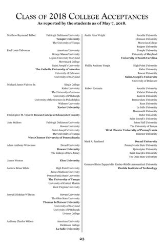 Class of 2018 College Acceptances As reported by the students as of May 7, 2018.