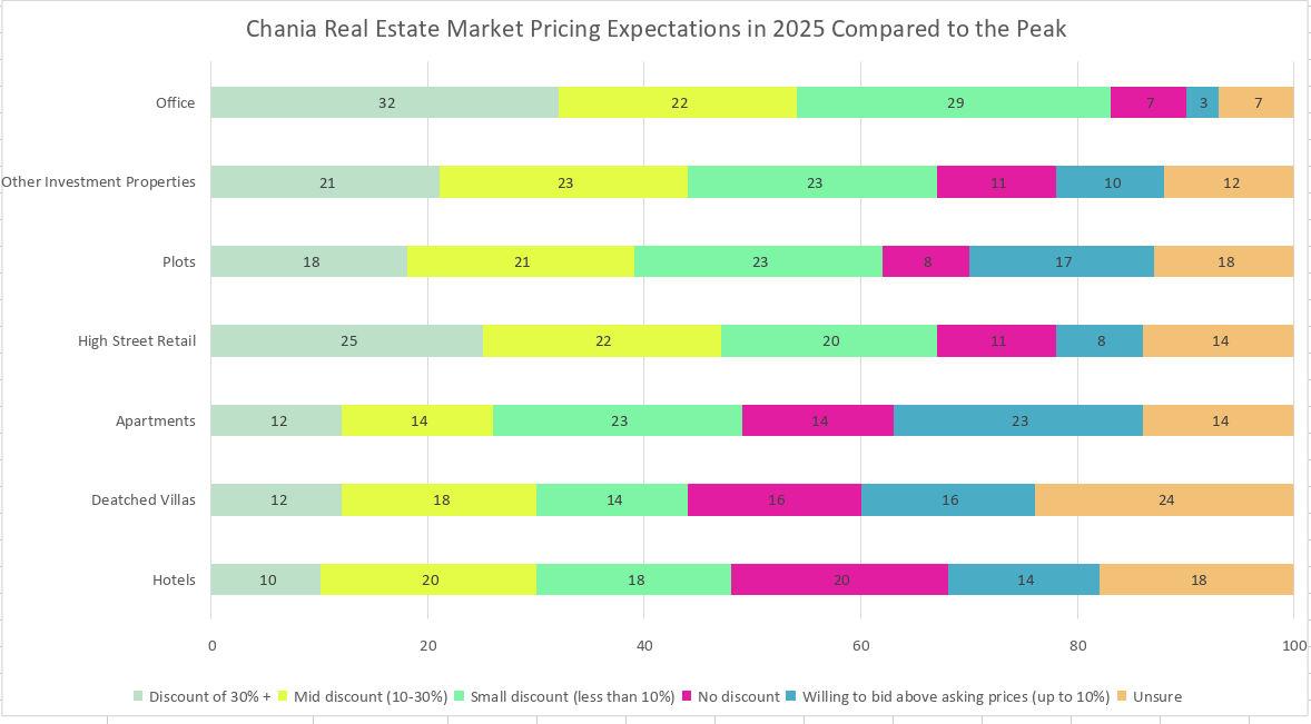 The graph illustrates the pricing expectations for the Chania real estate market in 2025 compared to previous peak levels. Office spaces show the highest proportion of anticipated significant discounts, with 32% expecting a price reduction of over 30%, and another 22% expecting mid-level discounts between 10-30%. Similar trends are observed in Other Investment Properties and Plots, where over 40% anticipate discounts of 10% or more.