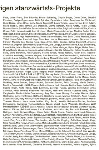 rigen »tanzwärts!«-Projekte Foos, Luise Frenz, Ben Bäumler, Bruno Schiering, Ceylan Beyaz, Devin Denk, Efrosini Pourtsas, Evelyn Oppermann, Felix Spindler, Fynn Mohr, Jakob Penzhorn, Jan Zühlsdorf, Kjeld Beese, Linus Ohse, Lotte Marie Tegethoff, Louis Temps, Luca Hoyme, Lynn Adam, Marie Raebel, Maxi Ternité, Josi Doschke, Moritz Bartsch, Nicola Grote, Robin Cordes, Rouven Kirsch, Sarah Faller, Susan Haberer, Beate Achilles, Brigitte Constein-Gülde, Christa Kruse, Edith Lewandowski, Leo Kirchner, Marie Ehrenreich-Lampe, Martina Bader, Petra Habekost, Sigrid Salmen, Silvie Schönberg, Steffi Vogelsang, Ulrich Lindner, Ulrike Schaper, Andrea Schötz, Anja Frasunkiewicz, Anna Melanie Bosse, Avni Salia, Celina Franzke, Doris Tittel, Hans-Peter Ibenthal, Inge Steenken, Justus Binnewies, Laurenz Gemmer, Lena Förster, Mariola Bas, Melisa Kaya, Saya Amin, Selin Dündar, Selma Dieckhoff, Annette Pietruska, Dagmar Schumacher, Elke Piesch, Jule Lange, Kathrin Steinke, Katja Schönberg, Liane Kuhle, Maria Fischer, Martina Gromadzki, Petra Metzger, Sylvia Böger, Ulrike Bosch, Ursula Busch, Wieslawa Kniejeski, Aiham Almasri, Camilla Schiegnitz, Cèline Kowohl, Djedi Sylla, Elena Borchers, Felix Caspary, Franka Groon, Frieda Nerger, Hanan Selo, IsabelleCharlotte Kosensky, Johanna Wagner, Joris Baumann, Josefine Hambsch, Karim Alo, Lara Jasinski, Laura Schüller, Marlene Schomberg, Mona Kreikemeier, Nora Fischer, Paula Böke, Sara Scheer, Selen Dede, Wanda Lang, Agnes Witkowski, Anna Werner, Carola Lüttringhaus, Jana Caase, Jens Mulkau, Jessica Gerschke, Katharina Gloria Hugentobler, Lena Herrmann, Michael Kazda, Nils Hillmann, Corvin Harm, Asta Lang, Beata Jasinski, Christian Meininghaus, Cornelia Rohse-Paul, Effi Maria Brüggener, Gudrun Klasmeyer, Jeannette Schmid, Katrin Schleusner, Kerstin Höger, Maria Kaspar, Peter Thiemann, Petra Jacobs, Silvia Klüger, Stephan Krück ich & ich & ich (2017) Berkay Arslan, Yasmin Esmer, Lore Harms, Jolina Jose, Anastasia-Viktoria Kelemen, Olesja Keln, Johanna Konopatzki, Lenia Masur, Sarah Penke, Janna Poersch, Isabelle Rieger, Melina Schrick, Jakob Sebralla, Paula Thon, Johannes Walkling, Anna Bender, Svenja Arpert, Susanne Bonfert, Felix Caspary, Marlis Dietrich, Martina Gromadzki, Kiki Hoffmann, Sabina Kaluza, Karin Kamolz, Melina Keuer, Isabel Klein, Sabine Kluth, Anita König, Gabi Lewinski, Lorenzo Puglisi, Jannika Schlehuber, Anna Schmidt, Nelly Theurer, Friederike Veit-Bauer, Mari Ines Waltke, Susanne Weiß, Marisa Zanghirella, Marie-Kristin Dannenberg, Jing Gao, Jaska Gering, Frederike Harms, Sylvia Hartmann, Anne Hoffmann, Katharina Koschera-Bosse, Markus Knoblich, Anke Krause, Stephan Krück, Katy Küster, Frauke-Ragna Lipprandt, Anita Loges, Laura Markurth, MarieTherese Mavers, Nora Jasna Müller, Jörg Puzik, Kerstin Reinecke-Fischer, Marlene Schomberg, Katharina Tschumitschew, Nicole Vogel, Doris Walasiak, Stephanie Wolf Heimathafen (2018) Beate Achilles, Angela Bleser-Baydur, Brigitte Constein-Gülde, Gertrud Färber, Reinhard Heuer, Leo Kirchner, Jutta Nitschke, Berthold Pieterek, Klaus Rathgen, Karin Schwerdtfeger, Klaus Seiler, Maria Stock, Frauke Lachmund-Giesecke, Lennart Abrahams, Ahmad Aldafees, Levin Bartsch, Karla Behrmann, Santina Caiola, Fabio Caruso, Leonie Cepin, Lena- Sophie Doschke, Magnus Estorf, Levin Färber, Andrik Feist, Jannik Flor, Emma Holtzhauer, Tim Janßen, Mia Sophie Jüngling, Salih Kara, Maylin Kaya, Mike Keune, Mila Ruby Lehner, Joshua Müller, Layal Saydam, Lena Smeikal, Patryk Sipowicz, Bennett Tödt, Laura Voth, Veit Wilhelm, Sophia Winkler, Alina Wodarka, Anfel Aoujd, Johann Barnstorf, Hannah Braunsberger, Esma Cümüsüdora, Sabrin Hakasch, Rania Magouri, Lisa Mirzoyan, Kajsa Piel, Anna Ritter, Mona Röttger, Jennie Schmedt-Barnstorf, Lisa Wende, Tan Xie Harn, Marte Anthon, Martina Bader, Wieslawa Kniejski, Christine König, Jule Lange, Claudia Lässig, Petra Metzger, Dörthe Neuber, Ursula Neuber, Sibylle Rieper, Lilo Schoerke, Katja Schönberg, Stefanie Schumann, Ellen Stehlig, Cordula Steingräber, Manuela Vierling, Stefanie Albrecht, Christiane Böhm, Katharina Bolsewig, Marie Elisa Leese, Annika Neidig, Rica Sander, Alina Schmidt, Christine Schmidt, Jasmin Haunschild, Valeria Algeier, Sylvia