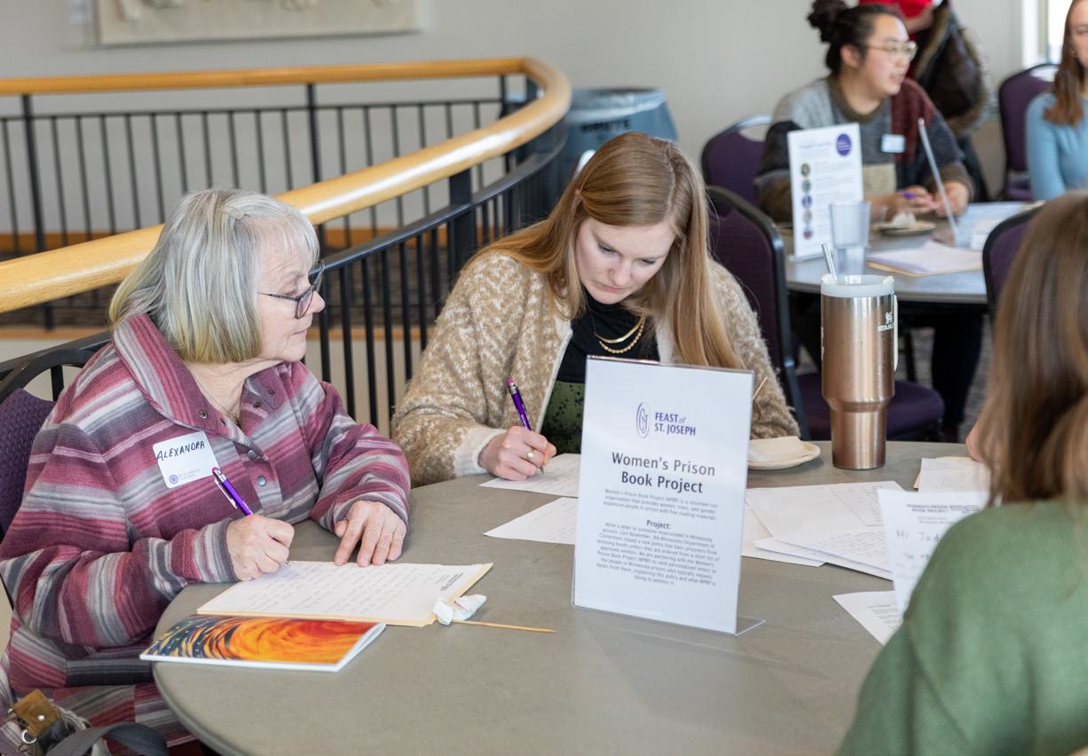 TOP LEFT AND BOTTOM RIGHT: OSSEIRAN-HANNA MEETS WITH ALUMNI AT REUNION. TOP RIGHT: ST. KATE’S COMMUNITY MEMBERS WORK TOGETHER ON SERVICE PROJECTS AT CITIZEN KATIE. BOTTOM LEFT: AN ALUMNA WRITES NOTES THANKING KATIE FUND DONORS.