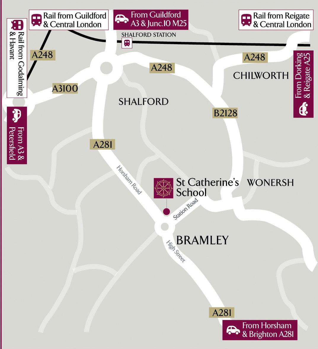 Join the A24 and travel for approx 18 miles to Horsham. Exit the A24 by the slip road and at the roundabout take the first exit left onto the A264. Continue straight across the next roundabout and at the following roundabout take the second exit joining the A281, signposted Guildford. Travel along the A281 for approximately 15 miles and on entering Bramley at the roundabout near the petrol station turn right onto Station Road. St Catherine’s Senior School is the first entrance on the left hand side, and the Prep. School entrance is second on the right.