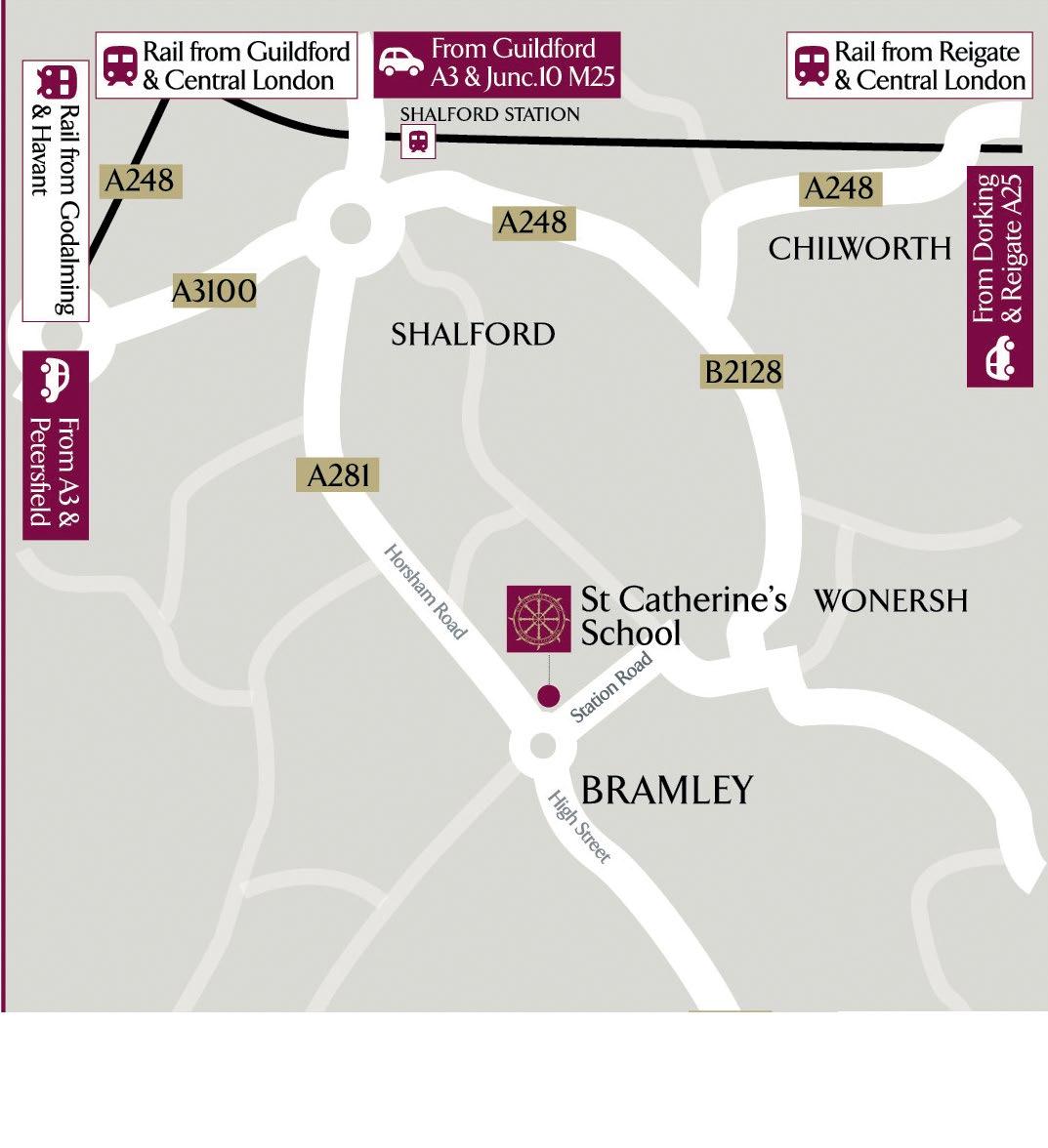 Join the A24 and travel for approx 18 miles to Horsham. Exit the A24 by the slip road and at the roundabout take the first exit left onto the A264. Continue straight across the next roundabout and at the following roundabout take the second exit joining the A281, signposted Guildford. Travel along the A281 for approximately 15 miles and on entering Bramley at the roundabout near the petrol station turn right onto Station Road. St Catherine’s Senior School is the first entrance on the left hand side, and the Prep School entrance is second on the right.
