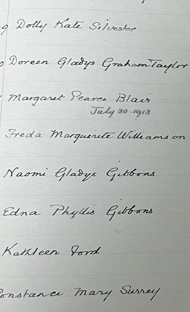 In April, we had a lovely email from a Mrs Jane Aldred who knew that her mother had attended St Catherine’s, and asking if the School Archive would be interested in some of her 1920s exercise books. We instantly replied with a resounding YES! Jane and her sister were delighted that we were able to send her a photo of the Registration Book showing the log of her mother’s admission to School, as well as a couple of photos of her time at St Catherine’s. Peggy Blair joined St Catherine’s in 1921, aged 8 years, and she stayed until U6 in 1931. The School Magazine helped us gain an insight into Peggy’s time at School: piano exams, an angel in the 1926 nativity, confirmation by the Bishop of Guildford in 1928, House Colours for Cricket, Tennis and Lacrosse, and we particularly liked seeing how she stayed in touch with School long after she had left, including an update from 1941 when she was working in an RAF hospital at Uxbridge, and return visits to School to play tennis.