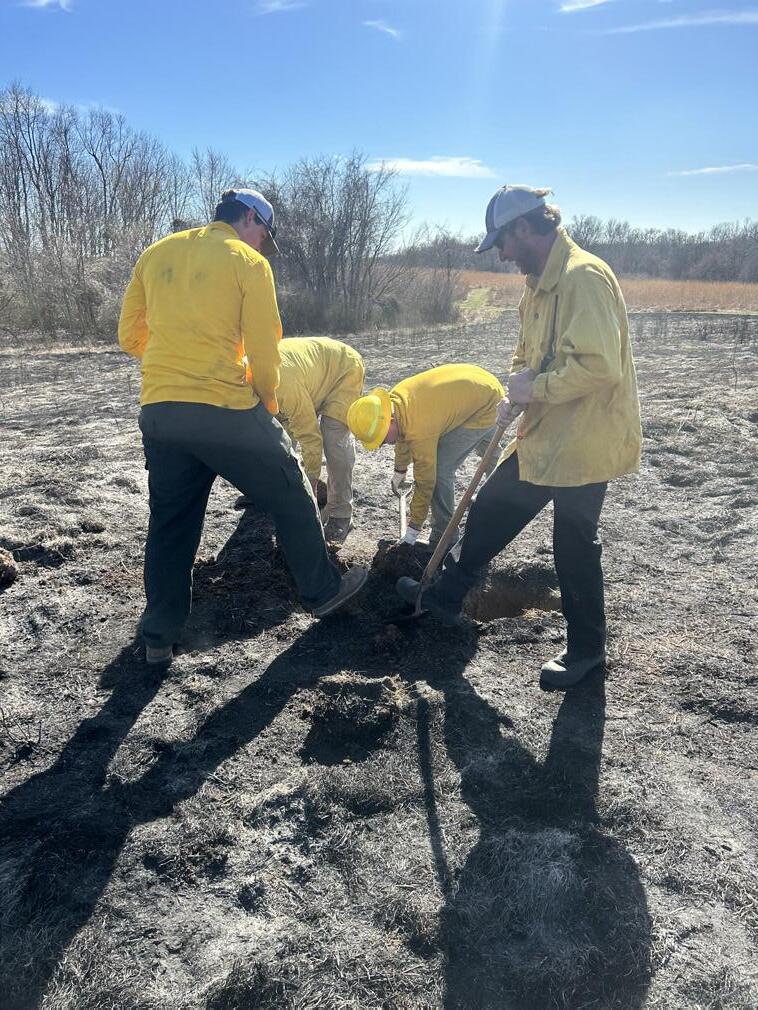 St. Charles County Parks Department conducted an early spring prescribed burn at Spring Bend Park on Wednesday, March 6. While checking the area after the burn, the natural resource team noticed multiple large holes in the prairie. Upon inspection, staff found a deer trapped in a hole that was roughly 5 feet deep. The deer appeared to have been stuck for awhile, and had clumps of dirt caked onto its fur. The staff was able to get some shovels to make the hole larger and help the deer escape. Once the dirt was removed, the deer immediately tried getting out but struggled as it was still a little too steep. Staff were able to reach down and help the deer out. The deer bounded away and ran toward the trees and brush like it was never stuck, and appeared to be in no harm and otherwise unaffected by the fire or smoke. Luckily, Parks staff was vigilant and able to save the deer!