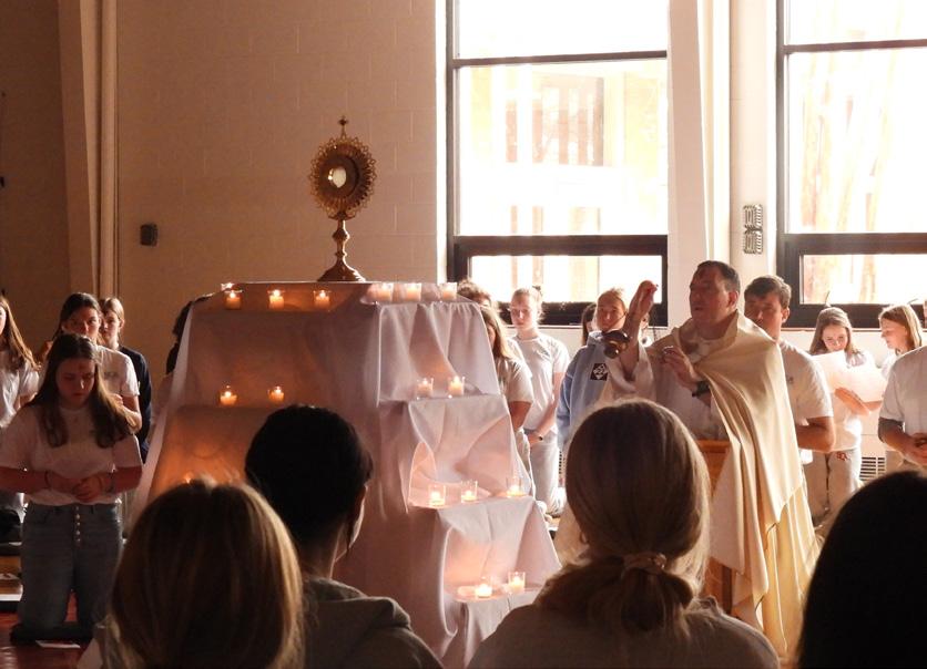 Usually held in February, the all-school retreat features a visiting priest and a well-known keynote youth speaker. Vibrant worship music, skits, activities and discussion, and student and faculty witness talks are all part of the day, as are Mass and Confession. A beautiful period of Eucharistic Adoration ends the day, and students come away encouraged and spiritually refreshed. All students are required to attend. Student leaders plan this day.