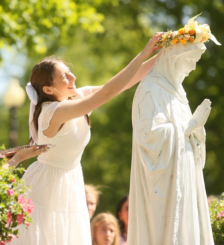 This traditional event in May is open to all mothers and has a long history at SCA. The seniors receive a rosary presented by the Alumnae Association, wear spring pastel dresses, and carry roses in a rosary procession to a statue of the Blessed Virgin Mary, followed by the rest of the student body. At the end of the procession, the President of Sodality, assisted by the Vice President of Spirituality for Sodality, crowns the statue of the Blessed Virgin Mary to show honor to Jesus’ mother after the rosary students are dismissed to enjoy lunch with their mom.