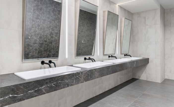 When designing with porcelain, you’ve got multiple options to make a marble-like statement – but more affordably and sustainably.