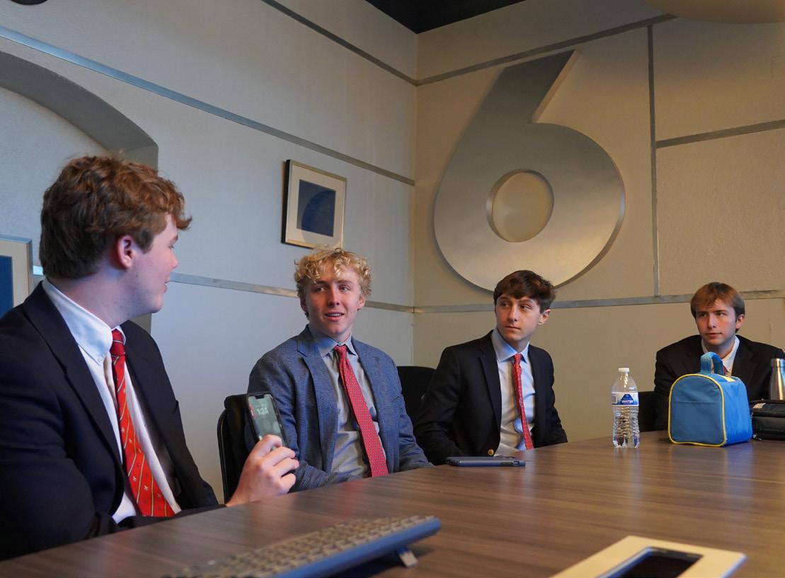 Team members Mac Dixon ‘24, Charlie Aghdami ‘23, Nicholas Manetas ‘23 and Jack Nelson ‘24 listen as host Cheryl Miller reads a question.