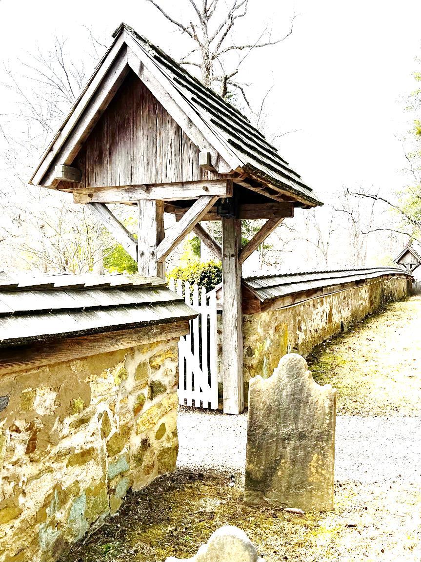The main entrance gate is known as a Lychgate, a prominent feature in English church architecture. The Lychgate has been traditionally used as a starting point for funerals and other church processions. The term “lych” comes from the AngloSaxon word for “corpse.” Records show payment for a new gate at Christmas 1784 in the amount of 22 Shillings 6 Pence. The latest rebuilding of the lychgate occurred in 2013 and utilized lumber from an early 19th century barn along with cedar shingles.