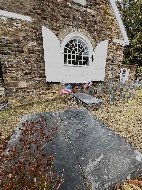 A large bluestone tablet at the church entrance marks the graves of Judge William Moore and his wife, Williamina. A well-respected Chester County Chief Justice and a member of the Provincial Assembly, William Moore held a hard loyalist position during the Revolution and was an owner of enslaved people. Their home, Moore Hall, was used by both British and American armies during the conflict. It still stands at Pickering Creek, Chester County. During the Encampment at Valley Forge in 1778 it served as the headquarters for Colonel Clement Biddle of the Continental Army. William Moore died in 1783 and Williamina died in 1784. Their gravestone is beautifully inscribed.