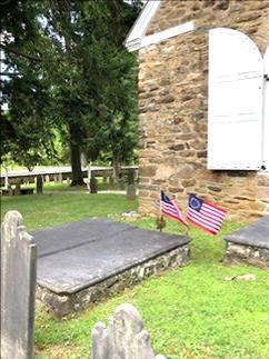 The graves of The Reverend William Currie and family are situated just beneath the chancel window on the east side of the church. Pastor Currie, a Scots missionary with three congregations (St. David’s, St. Peter’s in the Great Valley and St. James, Perkiomen) served from 1737 to 1776. He was a man of God who believed that to be true to his ordination vow he must pray for the king. He stepped aside from officiating at services when members of the Radnor Church objected. An indication of the troubled times was Rev. Currie’s struggle having one son, Richard, who became sick and died serving as a Patriot at General Washington’s encampment, and, another son, Ross, who joined the Corps of Pennsylvania Loyalists in Nova Scotia and never returned home.