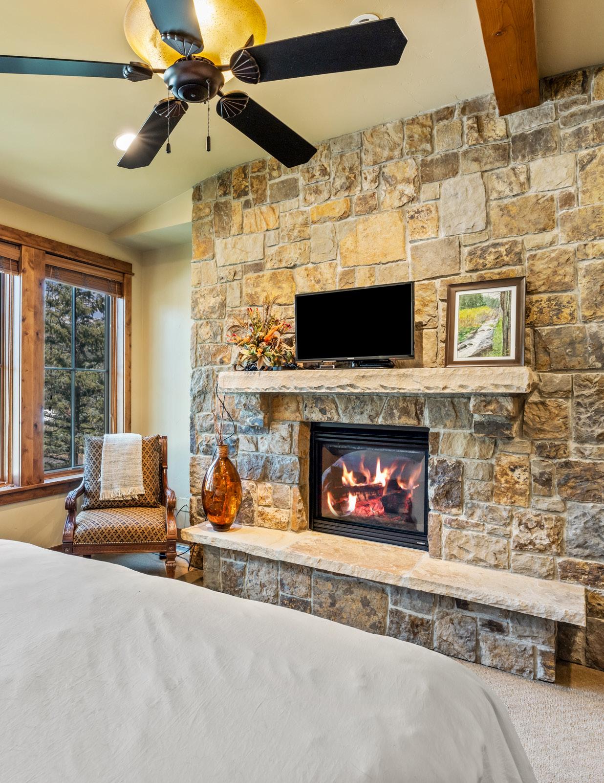 • Gas log fireplace, floor-to-ceiling stone surround, stone mantle