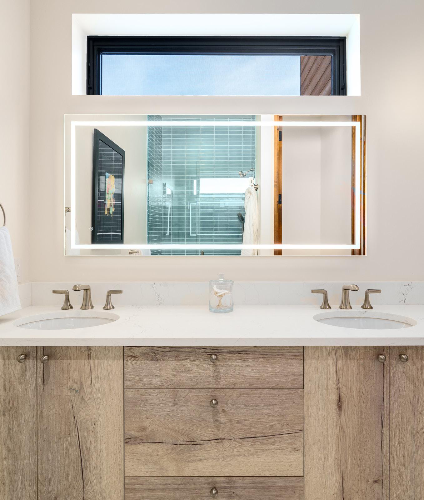 • En-suite bath- floating cabinetry, Quartz counters, glass shower w/ beautiful green tile