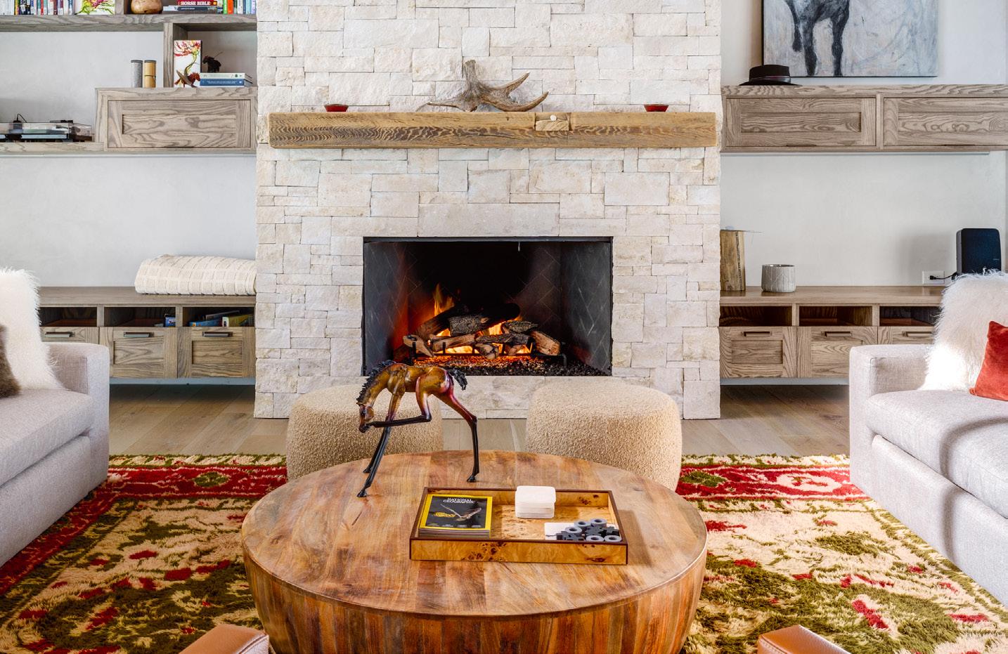• Soaring Colorado Buff stone surround gas fireplace, remove rock for TV wiring