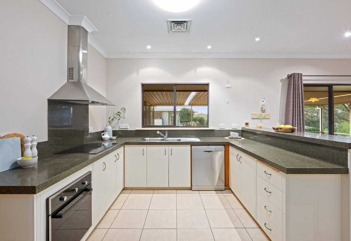 The main residence features three bedrooms, an all-electric kitchen with stainless steel appliances including a dishwasher and range hood, and an open-plan family/meals area warmed by a combustion heater. The master bedroom includes mirrored robes and a two-way bathroom, while ducted cooling and floor heating ensure year-round comfort. The updated laundry is fitted with an under-bench washing machine and clothes dryer for added convenience.