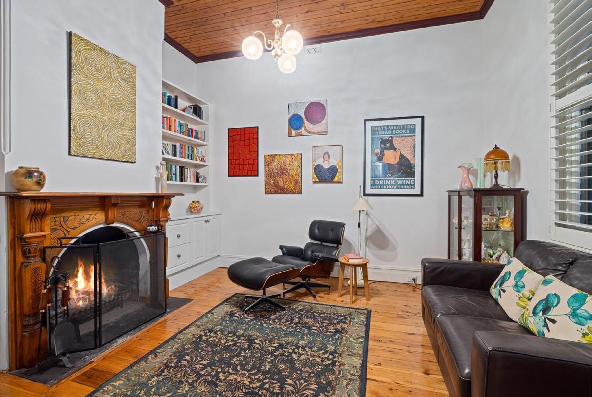 Inside, the layout delivers an effortless blend of period character and contemporary style. Three generous bedrooms feature built-in robes, with the master boasting a spacious walk-in robe and the second bedroom showcasing a charming capped fireplace. A dedicated study or library includes a working fireplace and built-in bookshelves, providing an ideal retreat or workspace.