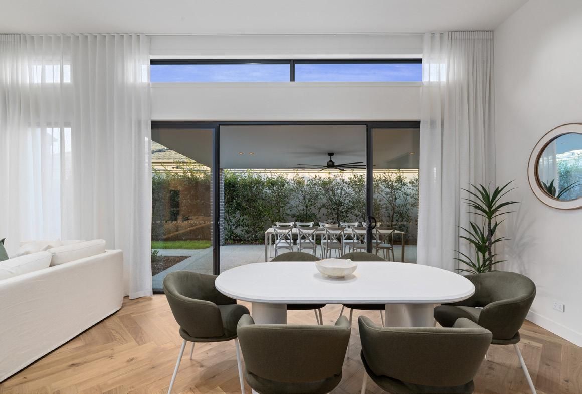 The expansive open-plan living area is awash with natural light, framed by glass doors that dissolve the boundary between inside and out. Here, entertainment is effortless, with the living and dining area flowing to a tiled alfresco space and manicured garden. Perfectly attuned to both grand entertaining and everyday living, the home’s versatile design also offers a refined sitting room at the entry, ideal as a formal lounge, media retreat, or an inspired home office.
